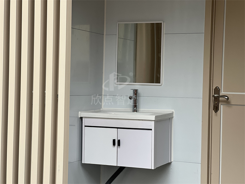 移動廁所內(nèi)部配置:洗手臺、鏡子、水龍頭