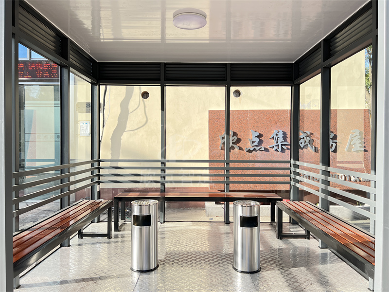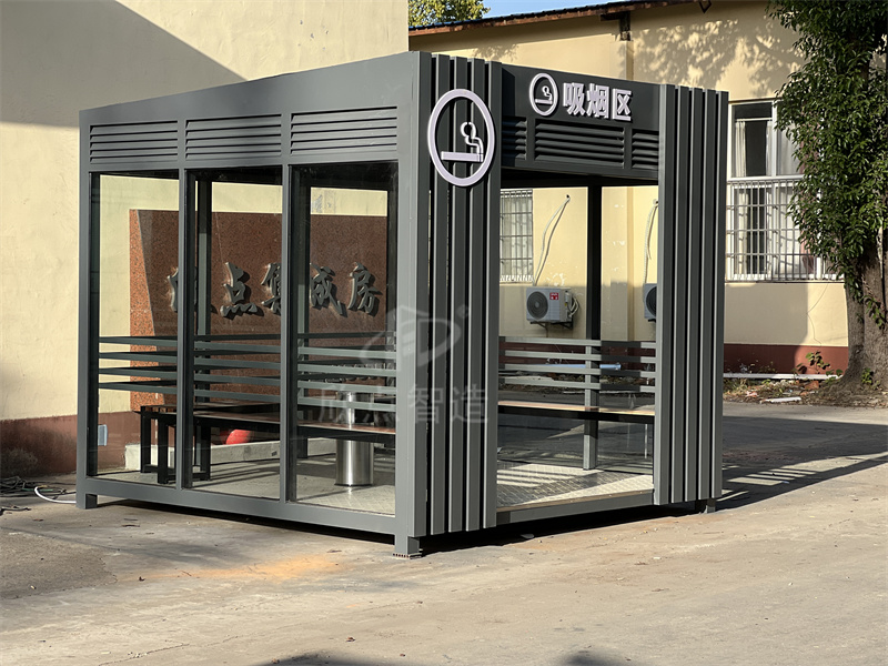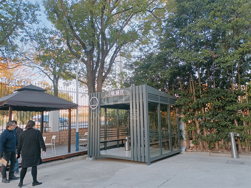 鋼化玻璃吸煙亭:光線明亮,安裝方便,工廠組裝好成品整體運(yùn)輸?shù)跹b到位,堅(jiān)固耐用,使用壽命至少十年,重型鋼結(jié)構(gòu),抗臺風(fēng)。頂部使用鋁板防水隔熱材料,保證下雨不漏水,隔音效果優(yōu)良。并且內(nèi)置電路,只要通電就可以在亭內(nèi)使用電力設(shè)施,室內(nèi)配置休息椅和煙灰桶,方便的功能,時尚的外觀,實(shí)在是廣大禁煙場所的不二之選!