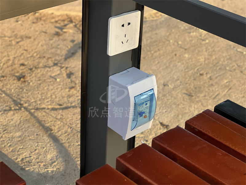 吸煙亭內(nèi)部配置:LED燈、休息椅、滅煙桶、開關(guān)、插座、配電箱