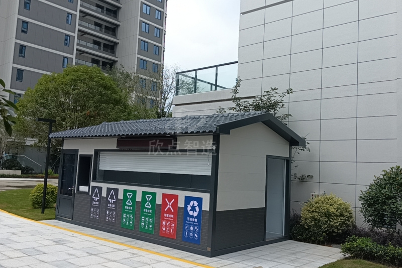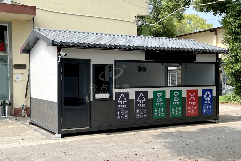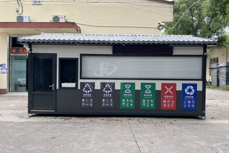 一款發(fā)往臺州市某小區(qū)的四分類垃圾房,尺寸3m×6m×3m。整體鋼架結構,經久耐用。外墻采用金屬雕花板材,隔熱保溫。垃圾房科學布局,共設置了可回收垃圾、廚余垃圾、有害垃圾、其他垃圾四分類六個投放口,并配有標識說明。投放口右側配備了洗手臺,便于投放后清洗雙手。獨立的工具房為后期清潔工具的存放和清洗提供了便利。